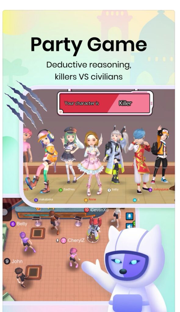 Social party games like Werewolf, Draw & Guess, Mic Grab, and more.
